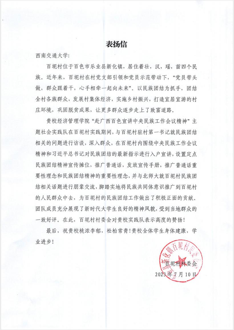 在四天的实践活动中,实践队遇上了同样前来学习调研的社会实践团队,遇上了当地热情淳朴的各民族同胞,遇上了深夜加班为群众解决问题的基层干部。实践结束后,百坭村村委充分认可了本次主题实践活动并向今年会jinnianhui发来表扬信。
