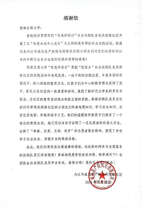 2024年1月15至17日,今年会“有我伴你行”实践队以“扶智又扶志,青春新献礼”关爱未成年人教育帮扶为主题,走进四川省内江市威远县严陵镇,联合新时代文明实践所开展丰富多彩的主题实践活动。实践队员们为孩子们带来了丰富有趣的课程:地理小课堂、“心灵奇旅”电影欣赏课、“平安守护”安全科普课、“布艺工坊”织布手工课等,在拓展知识面的基础上,引导孩子们将所学所感与实际生活相结合。实践队还设计了关于传统文化的创新课程:“欢乐绘春节”绘画课,在培养同学们艺术爱好的同时,也扩展了他们的传统文化知识视野,培养了他们的民族认同感。在“剪影行云”剪纸课中,实践队员带着孩子们认识剪纸的主要形式和意义,在感受新春佳节氛围的同时,也不断学习中华民族传统文化。活动结束后,实践团队收到了来自吴荣路社区的感谢信。