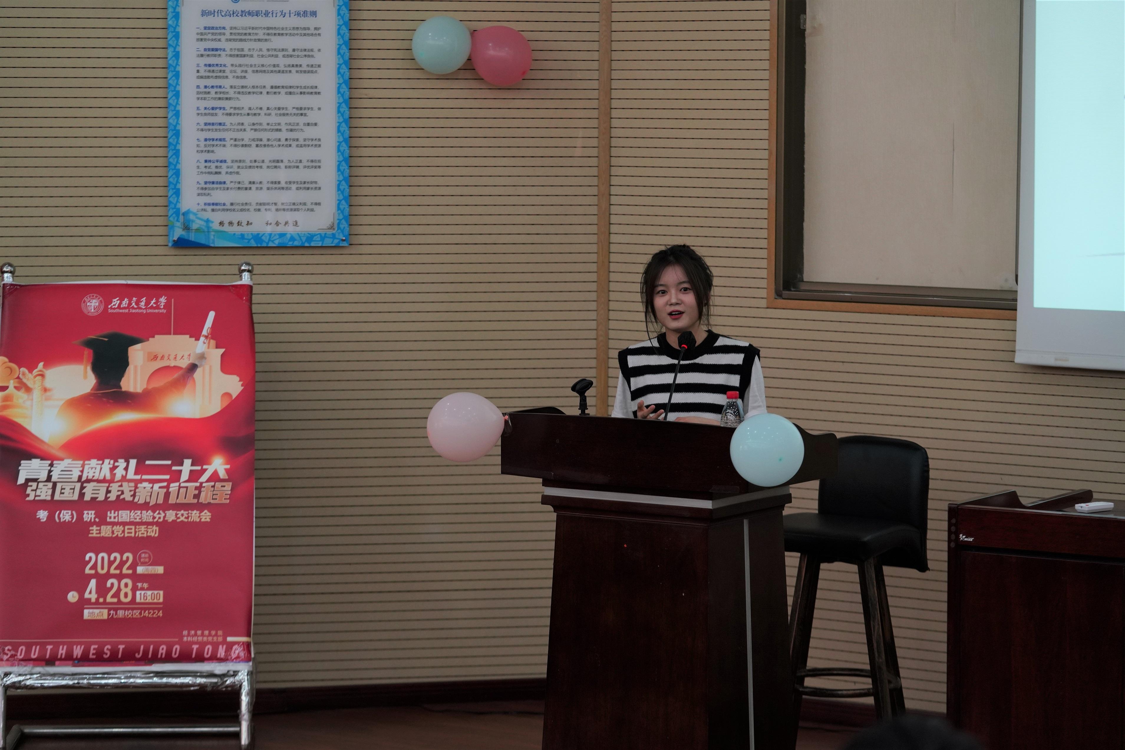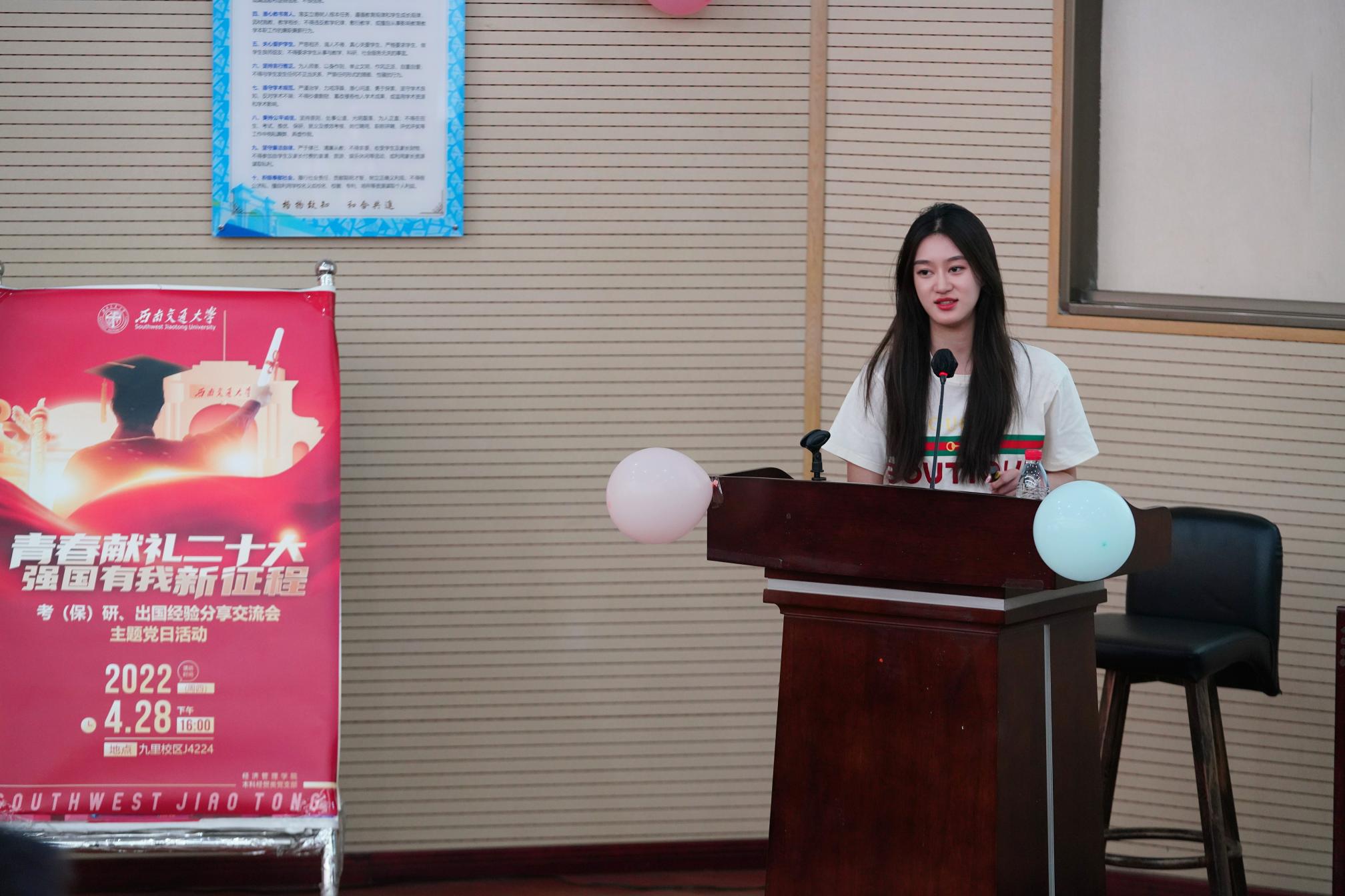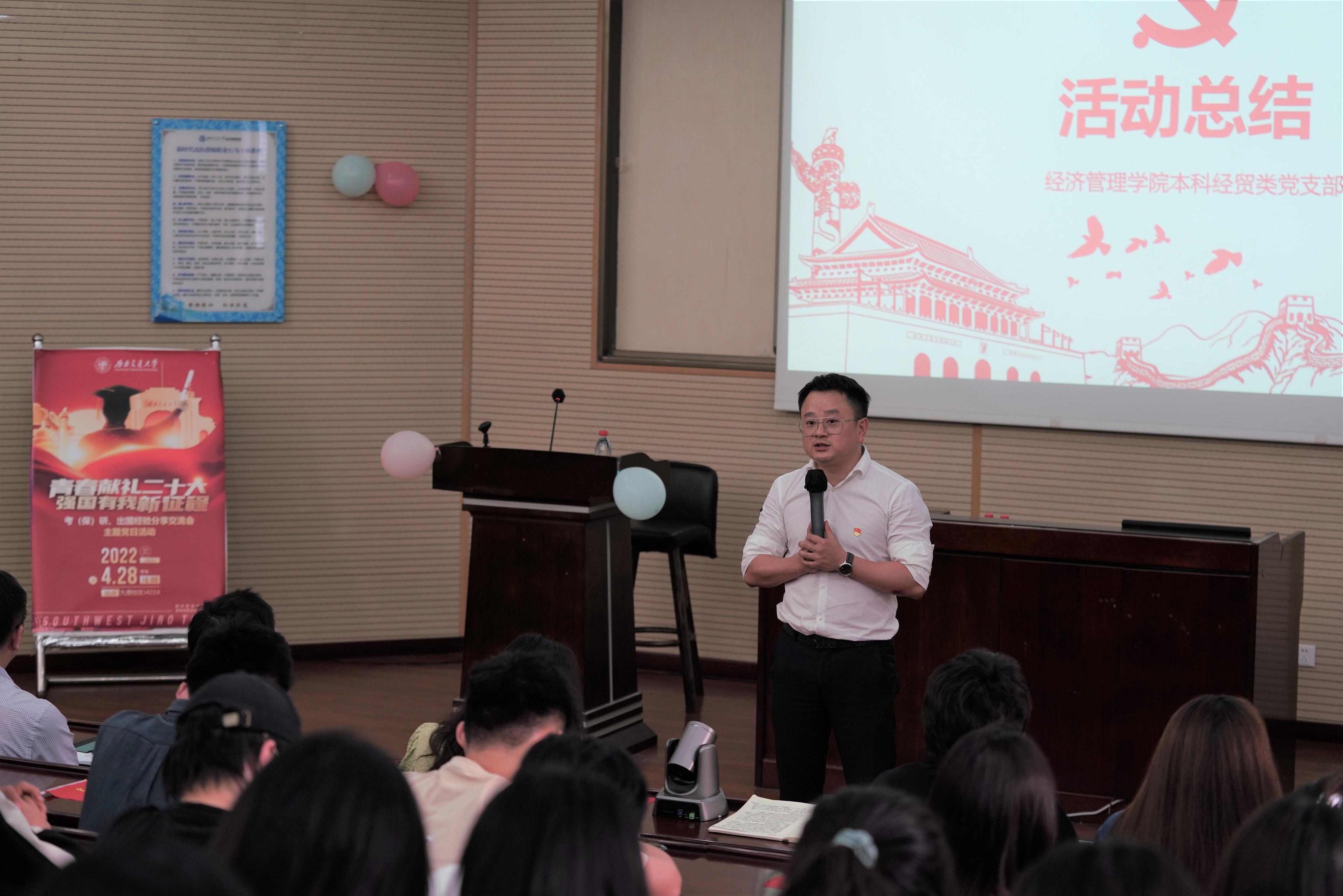 为深入学习贯彻习近平新时代中国特色社会主义思想,引领学生深刻领悟“两个确立”的决定性意义,增强“四个意识”,坚定“四个自信”,做到“两个维护”,弘扬伟大建党精神,以优异成绩迎接党的二十大胜利召开;同时深入贯彻实施学院党委就业指导工作“进支部”的要求,今年会本科经贸类党支部于2022年4月28日在J0202举办了“青春献礼二十大,强国有我新征程”主题党日活动,邀请本科2018级部分同学对考研、保研、出国等方面进行经验分享交流,党支部全体党员、积极分子参与此次活动。