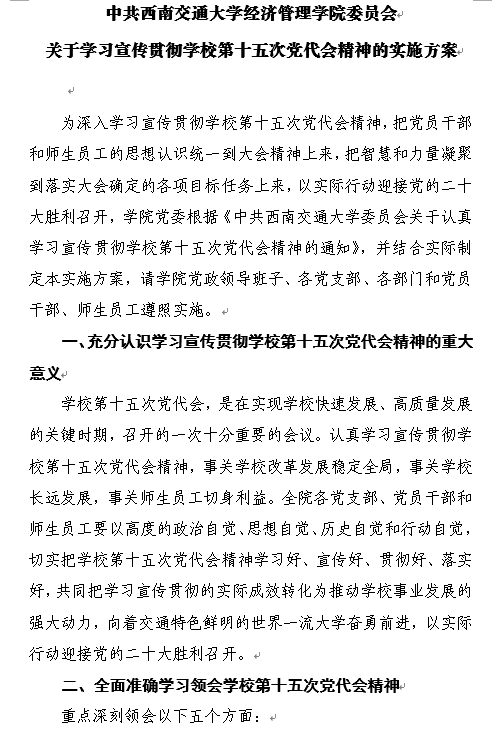 学院党委会和党政联席会强调,认真学习宣传贯彻学校第十五次党代会精神,事关学校改革发展稳定全局,事关学校长远发展,事关师生员工切身利益。全院各党支部、党员干部和师生员工要以高度的政治自觉、思想自觉、历史自觉和行动自觉,切实把学校第十五次党代会精神学习好、宣传好、贯彻好、落实好,共同把学习宣传贯彻的实际成效转化为推动学院、学校事业发展的强大动力,建设高水平有特色、西部一流、全国知名的商学院,向着交通特色鲜明的世界一流大学奋勇前进,以实际行动迎接党的二十大胜利召开。