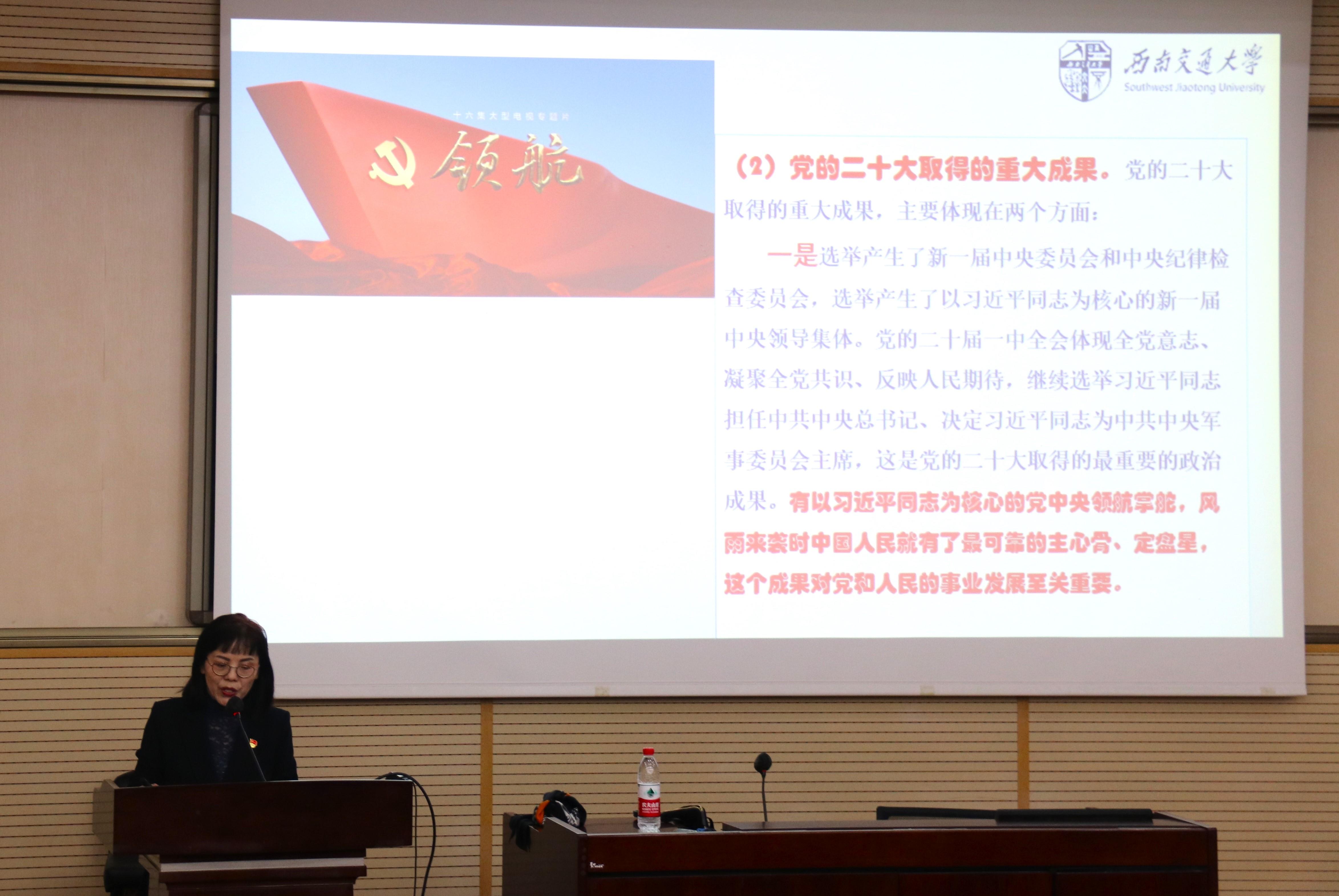 随后,何薇教授通过展示新时代十年伟大变革取得的重大成就,深入学习领会了过去五年工作和新时代十年伟大变革的重大意义,并就深入学习领会习近平新时代中国特色社会主义思想的世界观和方法论,强调了习近平新时代中国特色社会主义思想实现了马克思主义中国化时代化新的飞跃,对贯穿其中的“六个必须坚持”进行了解读,指出当代中国共产党人应坚持好、运用好习近平新时代中国特色社会主义思想的立场观点方法。