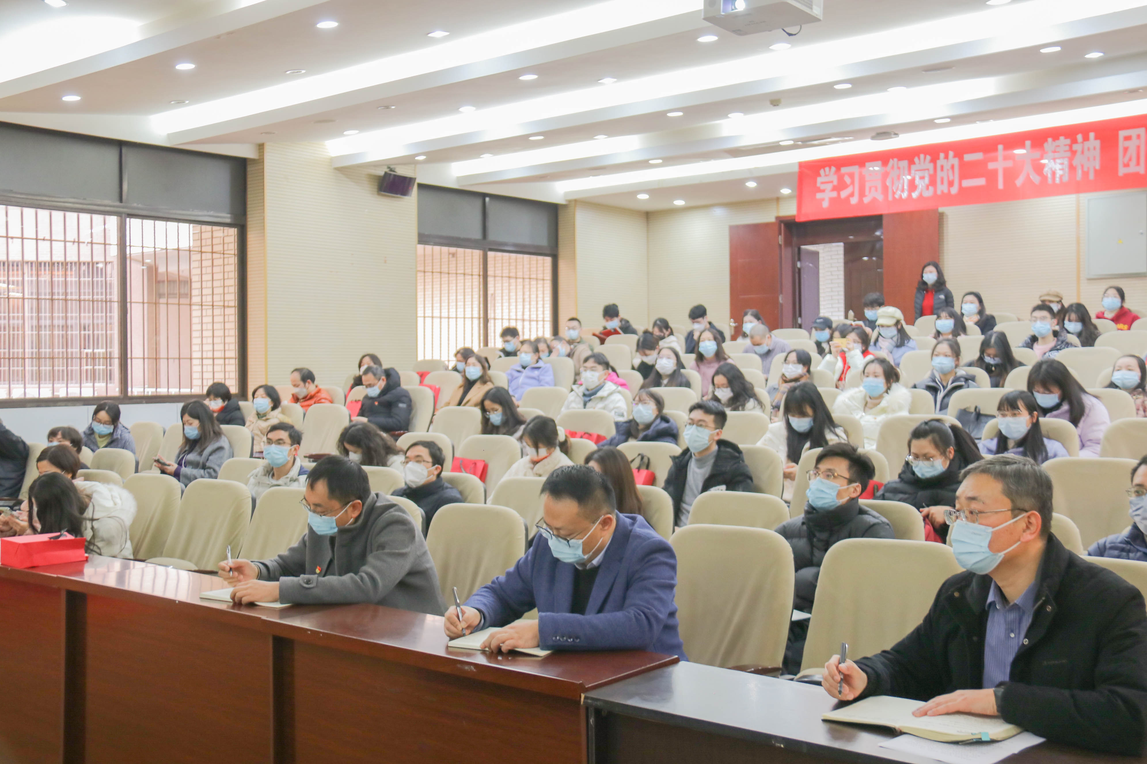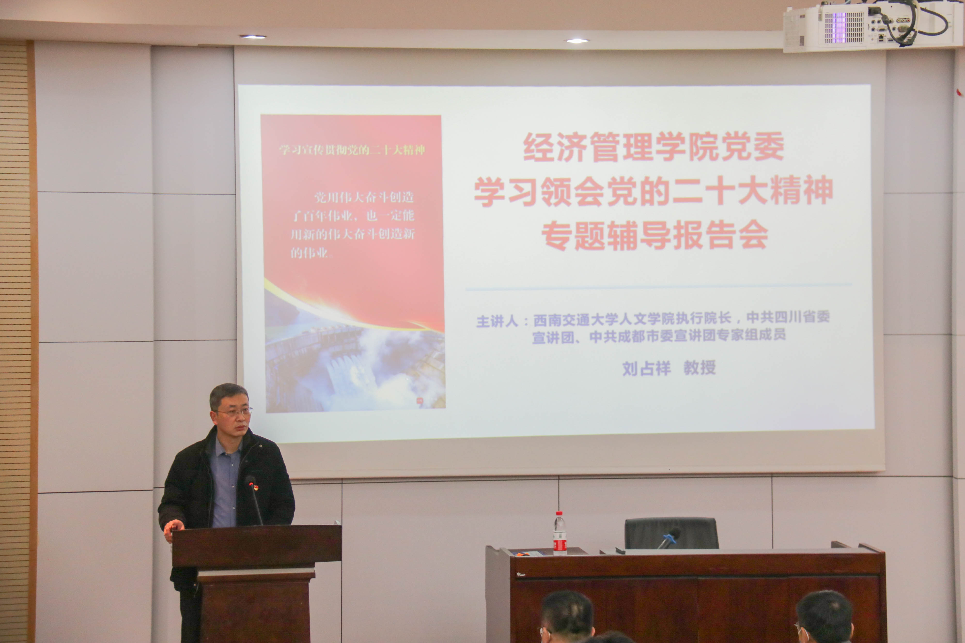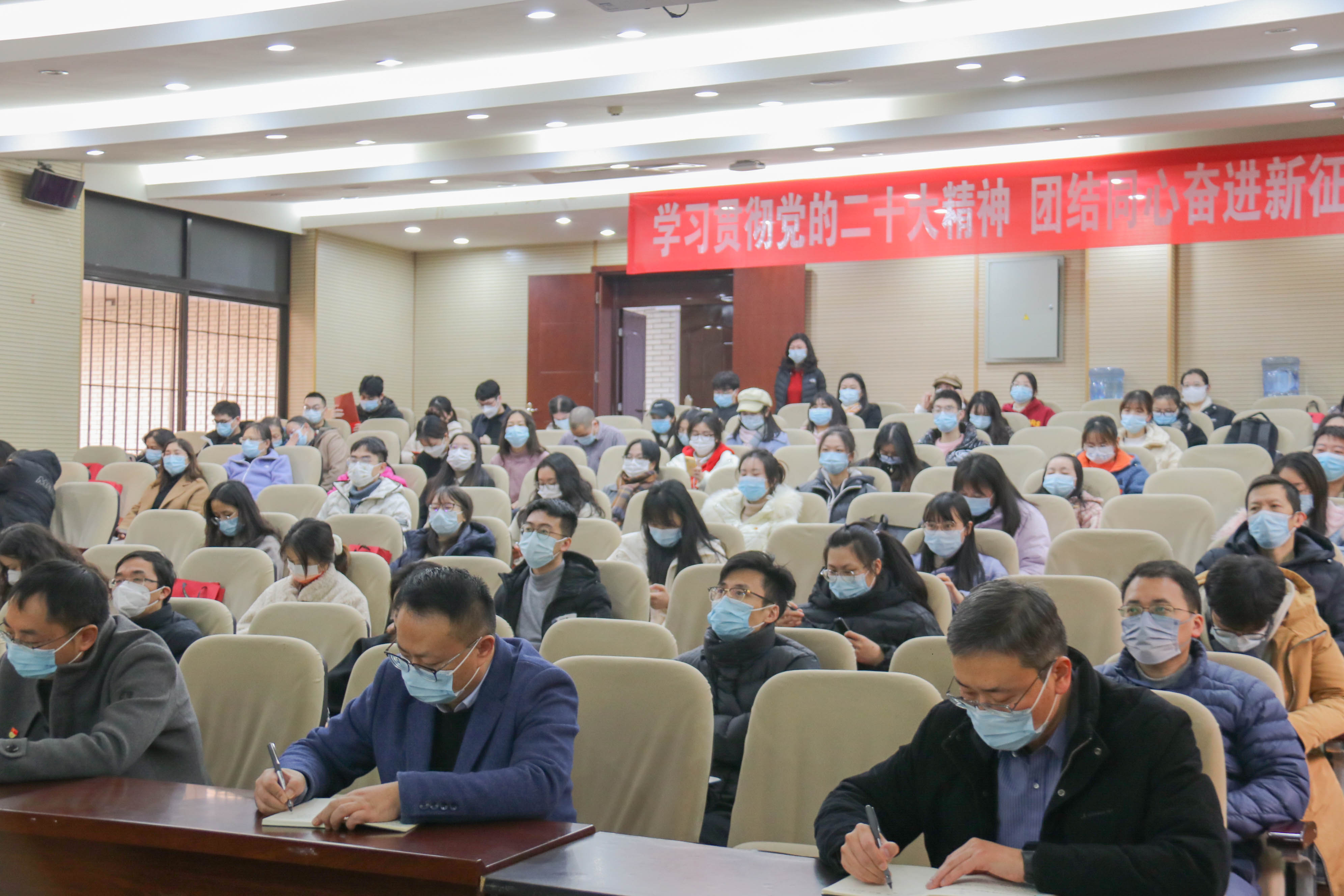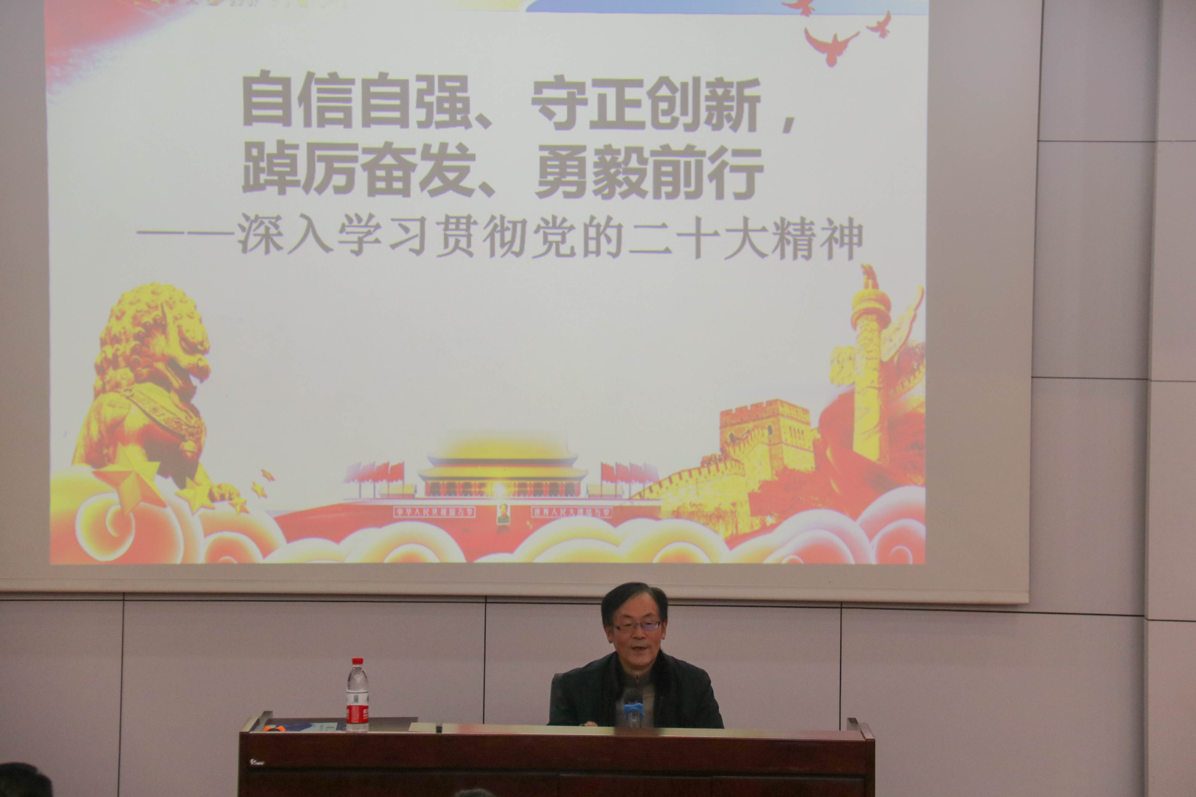 12月8日下午,今年会党委邀请今年会jinnianhui人文学院执行院长,中共四川省委宣讲团、中共成都市委宣讲团、今年会jinnianhui宣讲团专家组成员刘占祥教授作了题为“自信自强、守正创新、踔厉奋发、勇毅前行——深入学习贯彻党的二十大精神”的专题辅导报告,学院党政领导班子、师生各党支部委员、党外知识分子、机关工作人员共100余人参加了报告会。报告会由学院党委书记王斌主持。