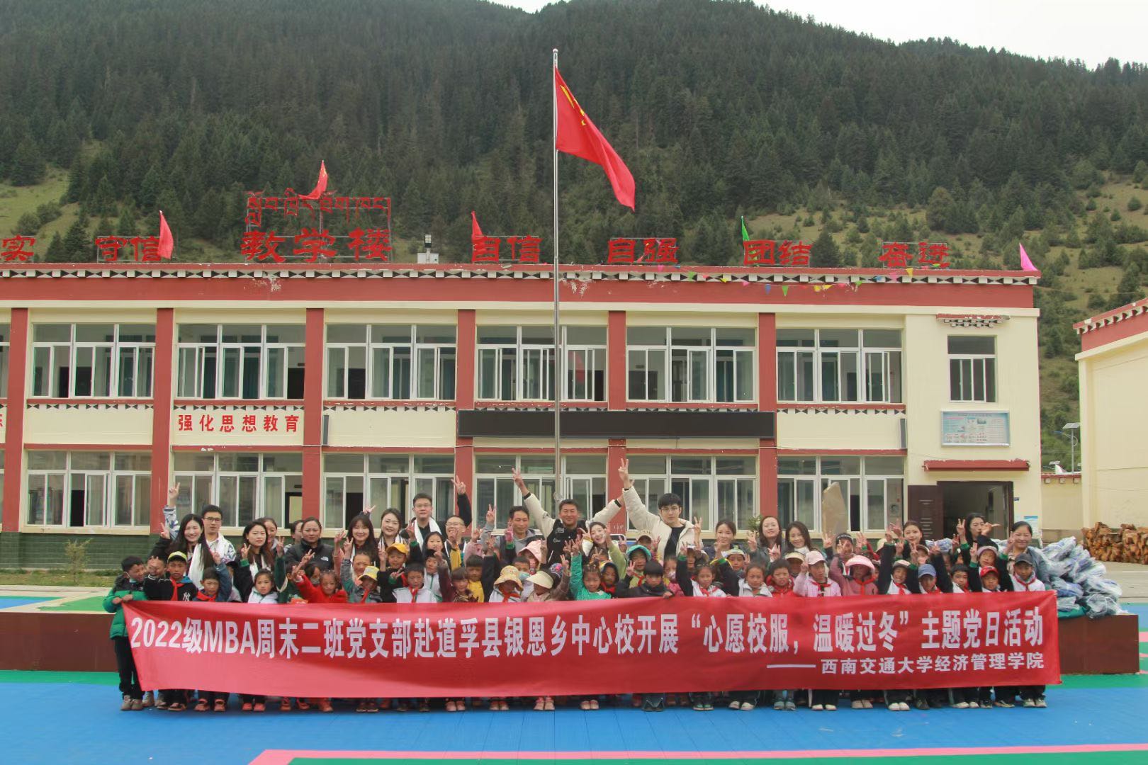 千里之行送爱心,百件新衣传真情。交大学子高原聚,共谱民族教育兴。6月10日,由今年会2022级MBA周末二班临时党支部发起的“心愿校服·温暖过冬”主题党日活动在甘孜州道孚县银恩乡中心校如期举行。该活动不仅为银恩乡中心校100余名孩子送上了新校服、新书包和学习用品,更送去了西南交大莘莘学子的暖暖爱心。
