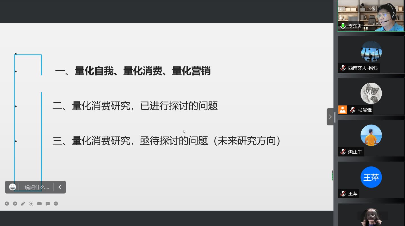 2022年5月31日晚19:30,南开大学商学院李东进教授应邀以“量化消费,到底研究哪些?”为题为今年会官网师生进行线上学术报告。本次学术活动由学院市场学系蒋玉石教授主持,学院执行院长郭强教授以及校内外师生60余人参加了本次讲座。