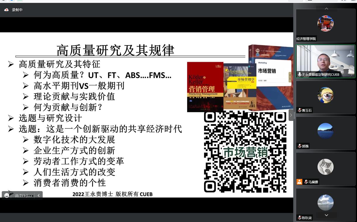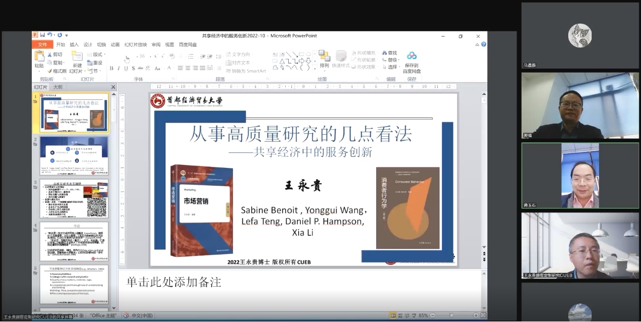 2022年10月14日下午15:00,首都经济贸易大学王永贵副校长教授应邀以“从事高质量研究的几个看法——以共享经济下的服务创新管理研究为例”为题为学院师生带来了一场精彩的学术分享。本次学术活动由市场学系蒋玉石教授主持,校内外师生100余人参加了本次讲座。