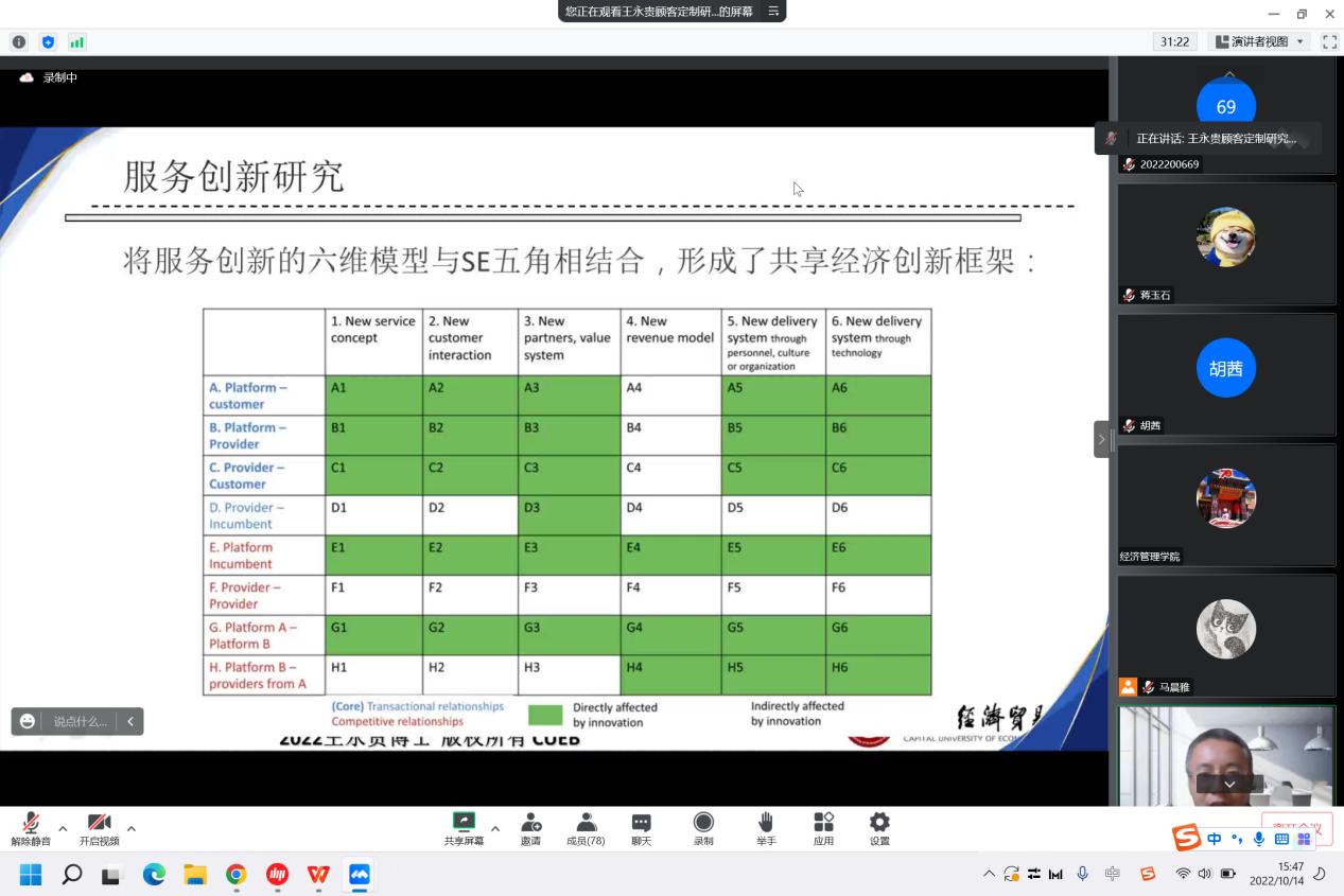 第二部分以“共享经济下的服务创新管理”为主题,王永贵教授对其今年发表于Journal of Business Research(JBR)的论文“Innovation in the sharing economy:A framework and future research agenda”从研究思路、研究框架、行文逻辑等多方面进行了剖析,带领师生了解高质量论文写作全过程,以期提升研究质量。