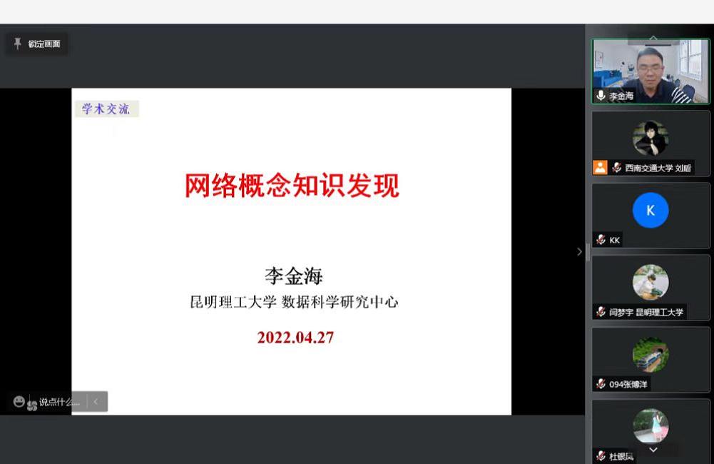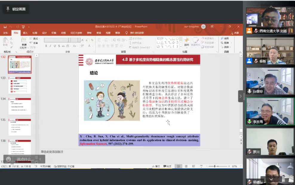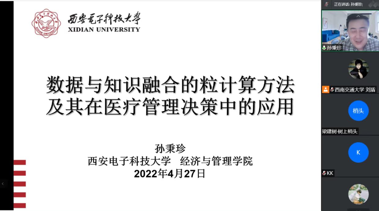 2022年4月27日下午2点,西安电子科技大学孙秉珍教授和昆明理工大学李金海教授应邀在腾讯会议上分别开展了题为“数据与知识融合的粒计算方法及其在医疗管理决策中的应用”、“网络概念知识发现”的线上学术报告。今年会信息系统与运营管理系刘盾教授主持了此次讲座,校内外师生100余人参加了此次学术交流。