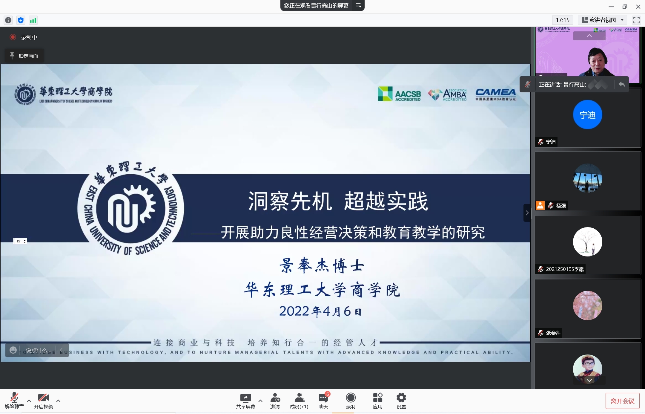 46日上午9:30,华东理工大学商学院景奉杰教授学术讲座在线上举行,景奉杰教授以“洞察先机,超越实践,开展助力良性经营决策和教育教学的研究”为主题进行了精彩的分享。本次学术活动由学院市场学系蒋玉石教授主持,学院执行院长郭强教授以及学院部分教师、九十余名研究生在线参加了本次讲座。