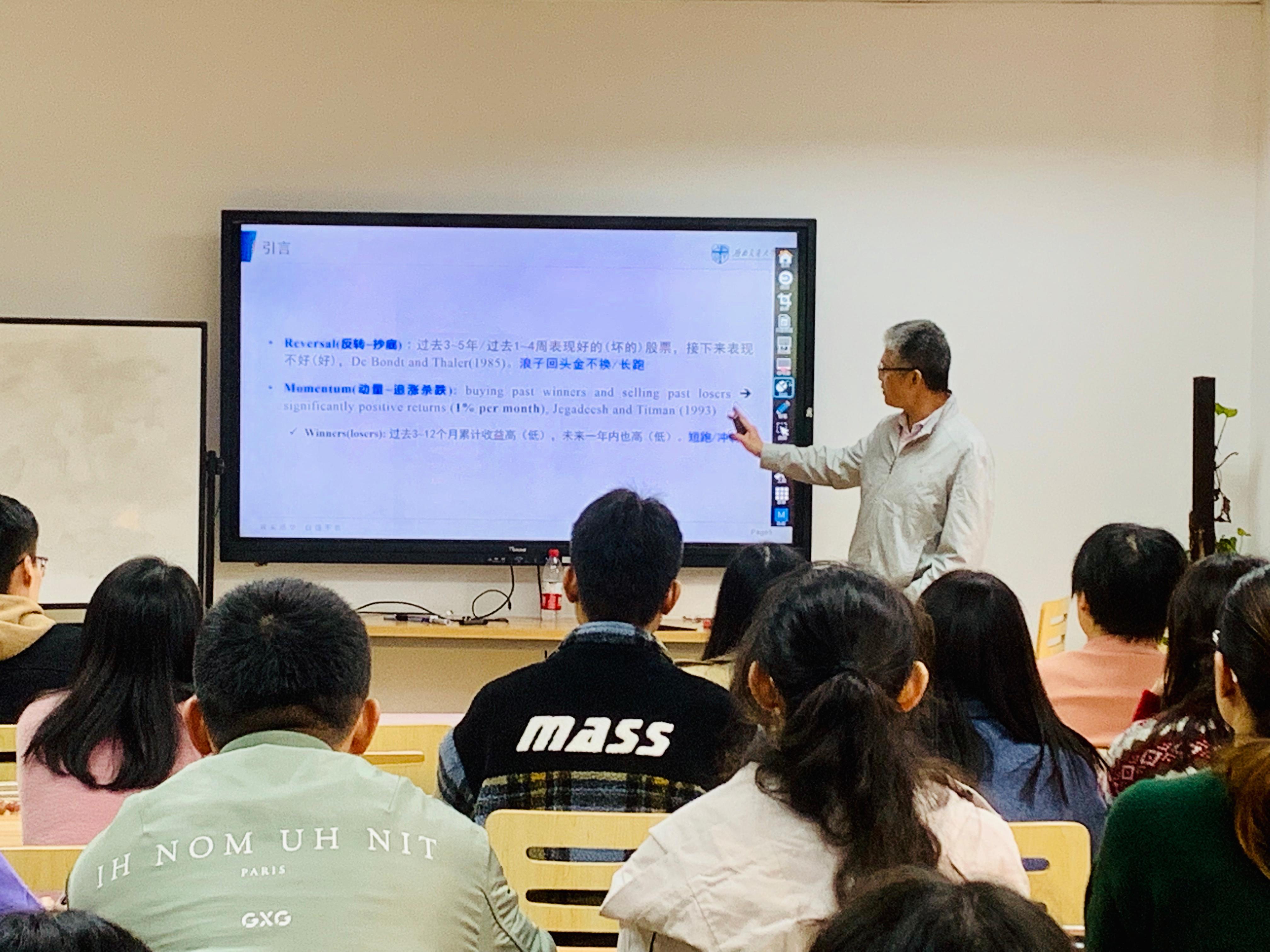 朱宏泉教授首先为大家进行了“破题”。为了让大家迅速把握论文核心观点,朱教授以在座师生共同的对金融学的热爱类比题目中的“共同覆盖”,又将“动量”、“溢出效应”比喻为“刹车时的惯性”、“人际交往中的正能量转递”,拉近学术与生活的距离,也让大家对主题更为明晰。