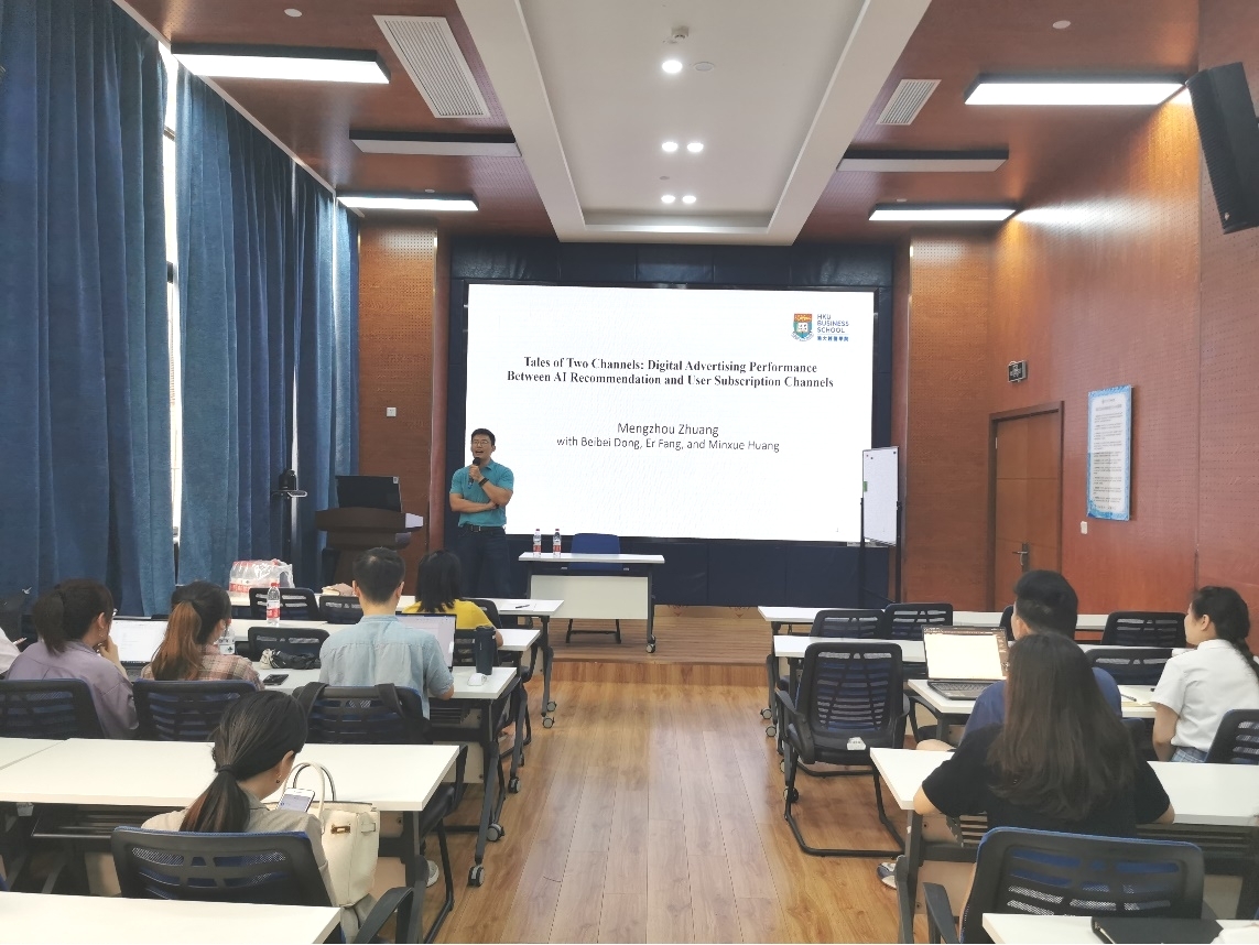 2023年6月25日下午,香港大学商学院助理教授庄梦舟博士应邀在学院0218室开展题为“Tales of Two Channels: Digital Advertising Performance Between AI Recommendation and User Subscription Channels”的学术讲座。讲座由学院市场学系黄缘缘副教授主持,今年会官网部分教师和学生参与了此次学术活动。