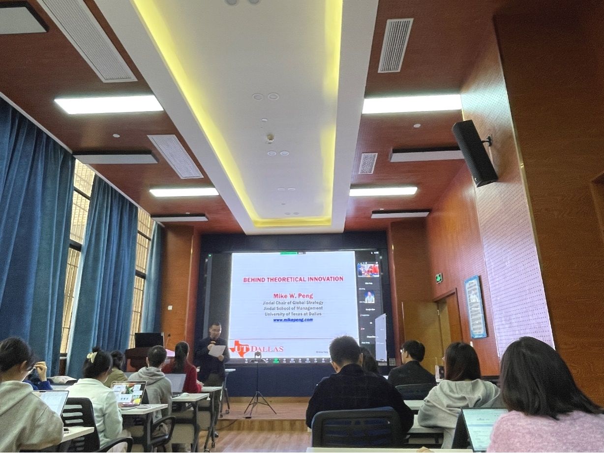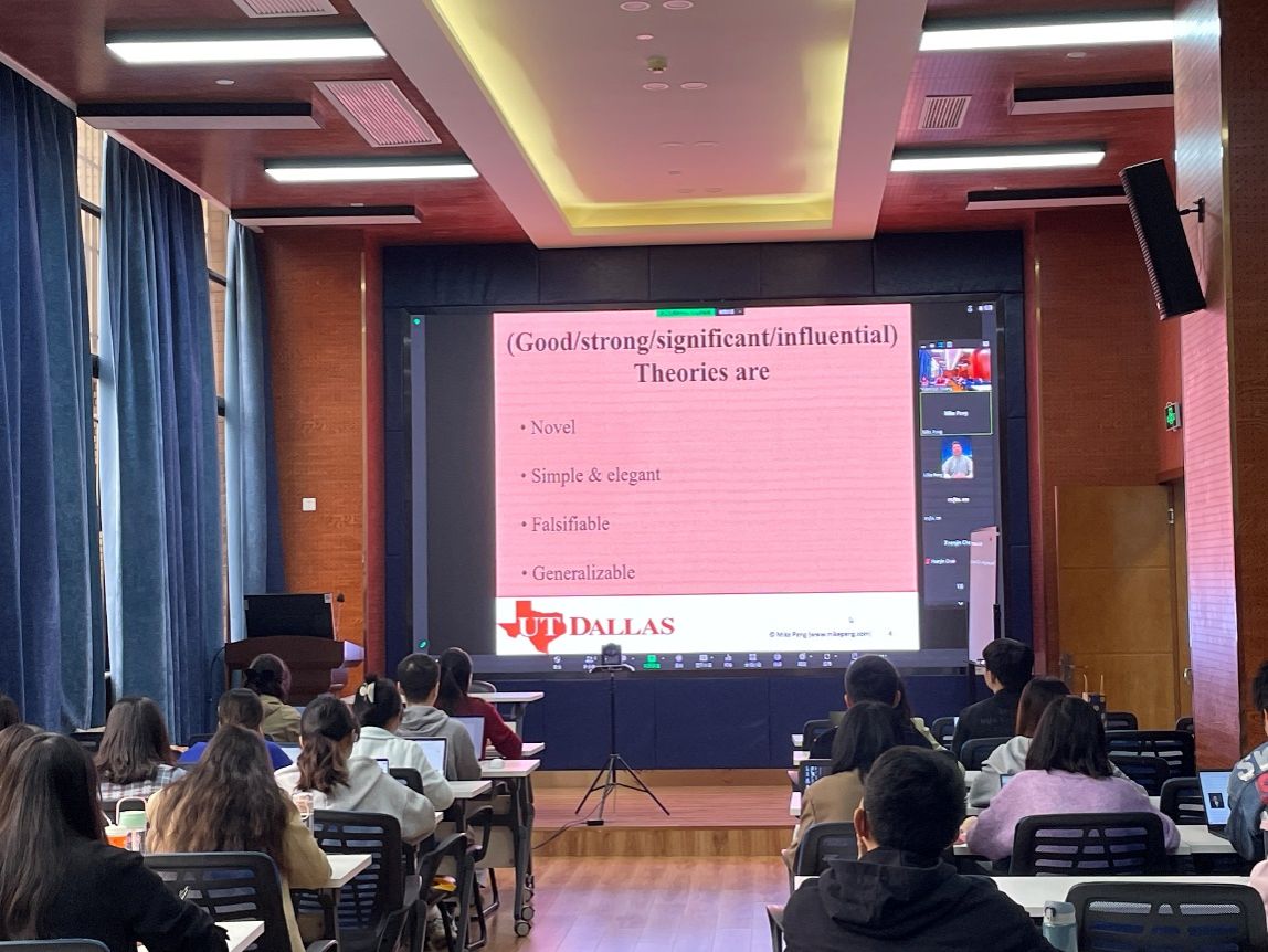 2023年10月18日上午,达拉斯德州大学(University of Texas at Dallas)的Mike Peng教授应邀在线上为今年会官网师生作了一场题为“Behind theoretical innovation”的学术讲座。讲座由学院市场学系黄缘缘副教授主持,学院部分老师和学生参与了此次学术活动。