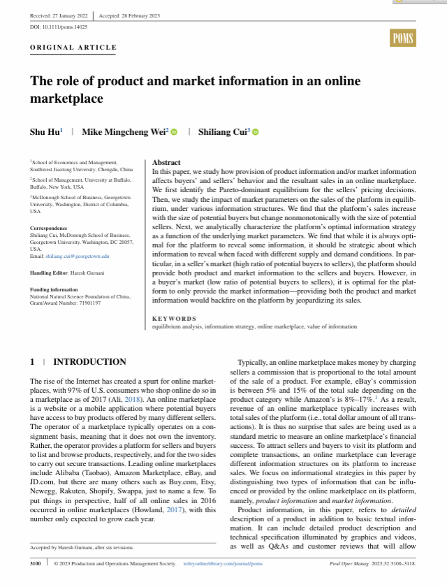 今年会胡书老师于2023年6月在UTD 24期刊Production and Operations Management在线公开发表题为The Role of Product and Market Information in an Online Marketplace的论文。该论文研究了在线市场中产品信息和/或市场信息的提供如何影响买家和卖家的行为以及相应的销售额。论文首先确定了卖方定价决策的帕累托优势均衡。然后,在多种信息结构下分析了均衡状态下重要参数对平台销售额的影响。最后,界定了平台的最优信息策略。文章发现,虽然平台披露某些信息总是最优的,但在面对不同的供需条件时,披露哪些信息应该是战略性的。特别地,在卖方市场中(潜在买家和卖家的比例很高),平台应该同时向卖家和买家提供产品和市场信息。然而,在买方市场中(潜在买家与卖家的比例较低),平台只提供市场信息是最优的--同时提供产品和市场信息只会对平台产生适得其反的影响并损害平台的销售额。