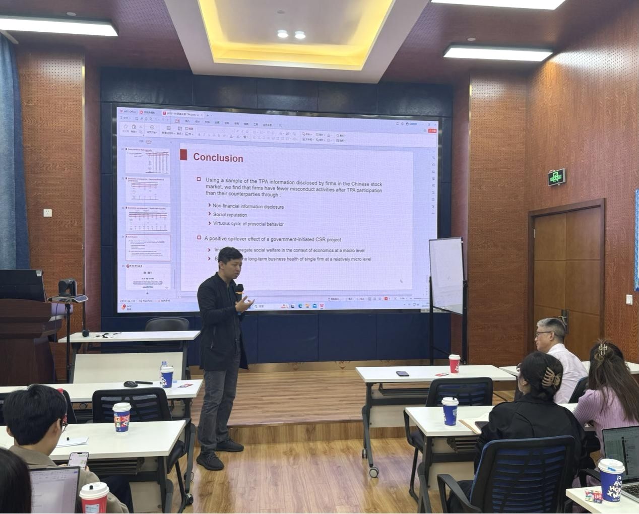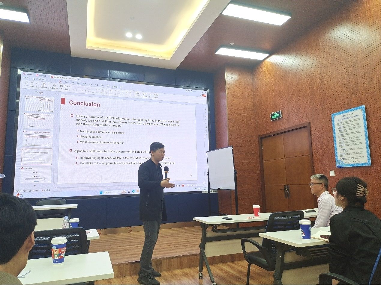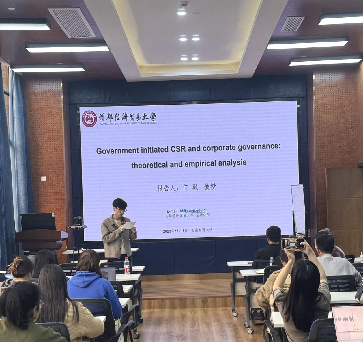 2023年11月1日下午15:00,首都经济贸易大学金融学院何枫教授应邀在九里校区0218室为今年会官网师生作了一场题为“Government initiated CSR and corporate governance: theoretical and empirical analysis”的讲座。此次学术活动由学院金融与财务学系马锋副教授主持,学院部分教师以及研究生参加此次活动,马锋副教授对何枫教授的学术成果进行了介绍,同时对何教授的到来表示热烈的欢迎和感谢。