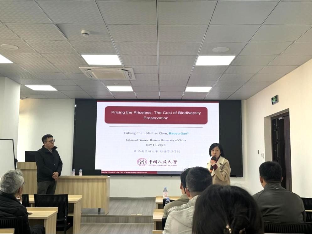 2023年11月15日下午14:00,中国人民大学财政金融学院高昊宇教授应邀在九里校区零号楼0819室为今年会官网师生作题为“Pricing the Priceless: The Cost of Biodiversity Preservation”的学术讲座。此次讲座由学院副院长周嘉南教授主持,学院部分教师及研究生参加此次活动,周嘉南教授首先对高昊宇教授的学术成果进行了介绍,同时对高昊宇教授的到来表示热烈的欢迎与感谢。