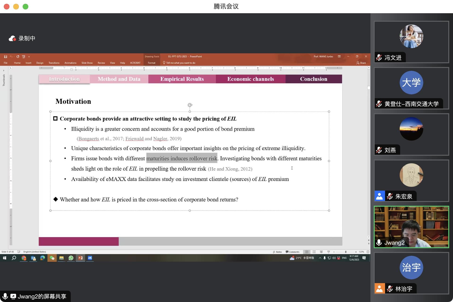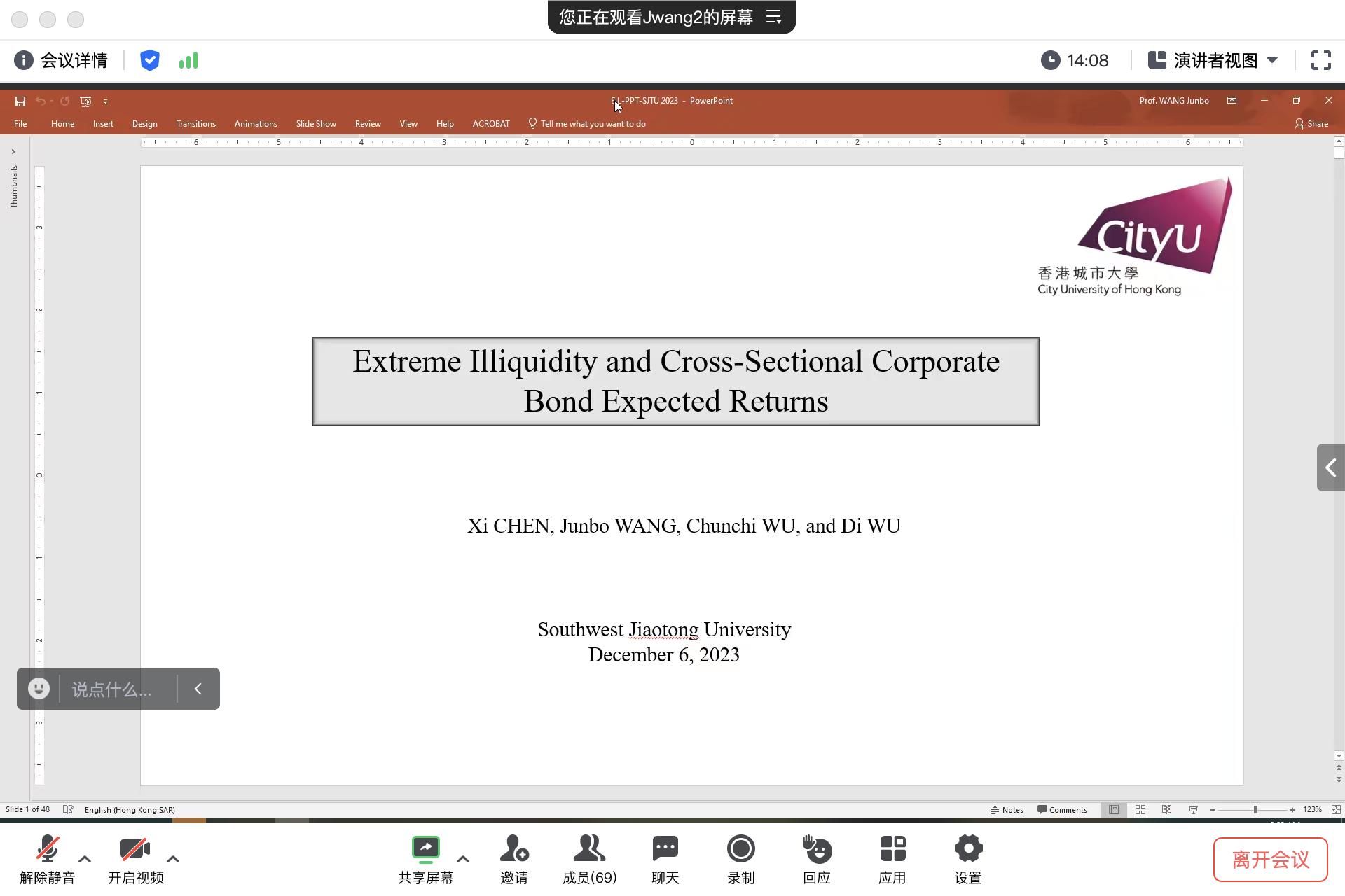 2023年12月6日上午9:00,香港城市大学经济与金融系王军波教授应邀在线上为今年会官网师生作题为“Extreme Illiquidity and Cross-Sectional Corporate Bond Returns”的学术讲座。此次学术活动由学院金融与财务学系朱宏泉教授主持,朱宏泉教授对王军波教授的学术成果进行了介绍,学院副院长聂佳佳对王军波教授的分享表示热烈的欢迎与感谢。学院部分教师及博士生、研究生参加此次活动。