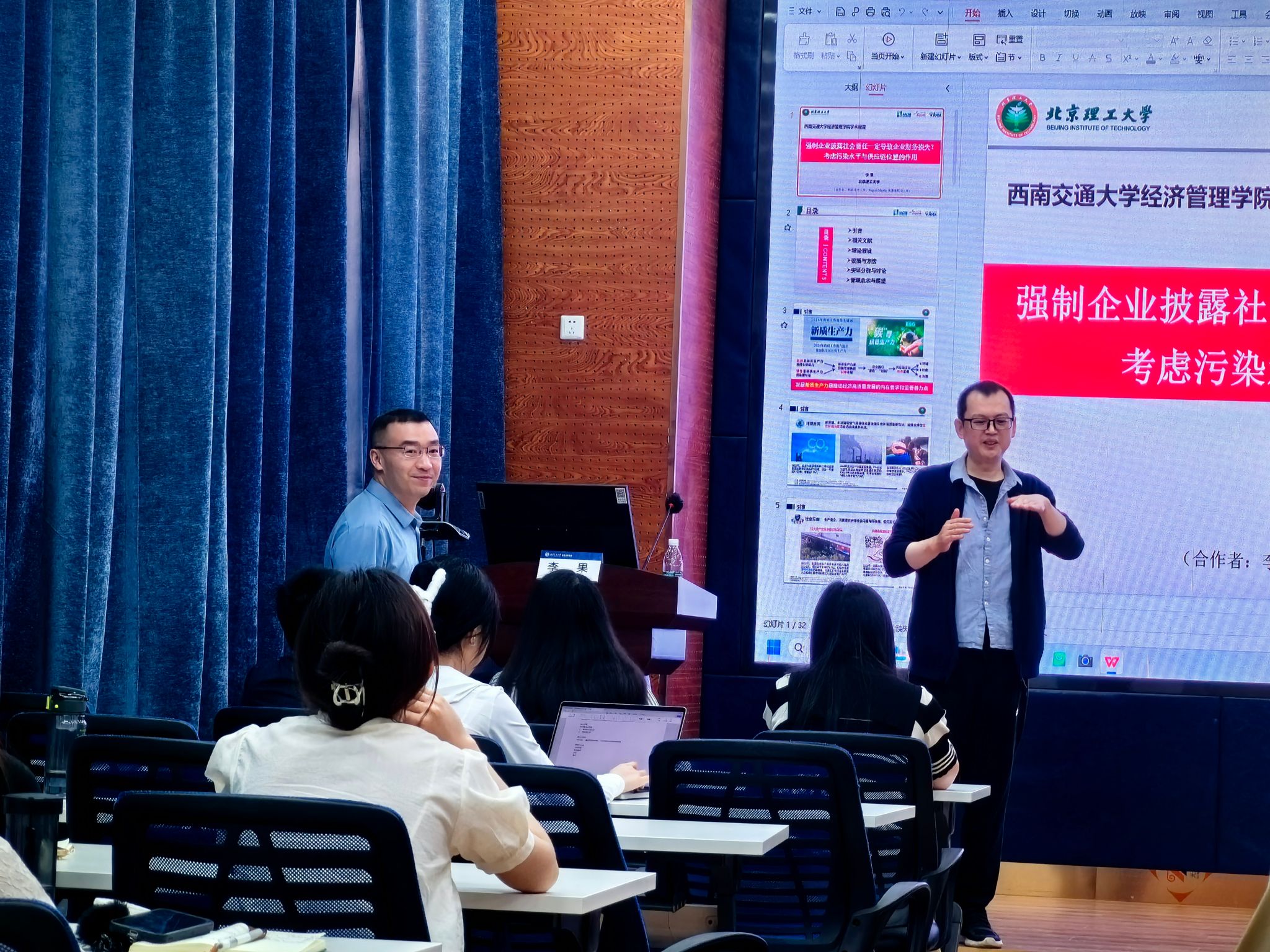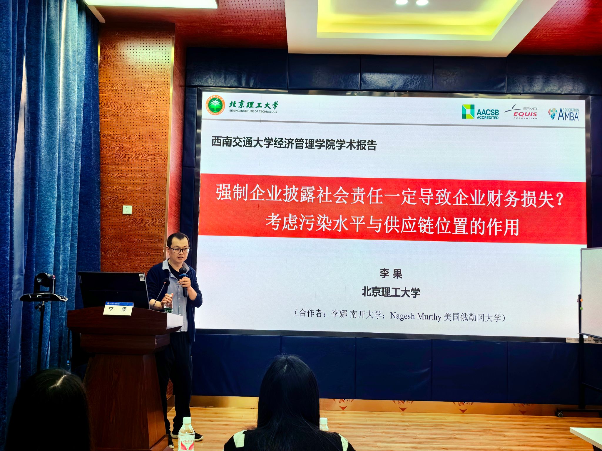 2024年5月24日,北京理工大学管理与经济学院管理科学与物流系主任,国家高层次人才计划入选者李果教授应学院邀请,来今年会官网展开学术交流活动,交流主题为“强制企业披露社会责任一定导致企业财务损失?考虑污染水平与供应链位置的作用”。本次学术活动由学院副院长聂佳佳教授主持,学院部分教师、博士生和硕士生等50多人参加了此次学术活动。聂佳佳教授首先对李果教授的学术成果进行了介绍,同时对李果教授的来访表示热烈的欢迎!