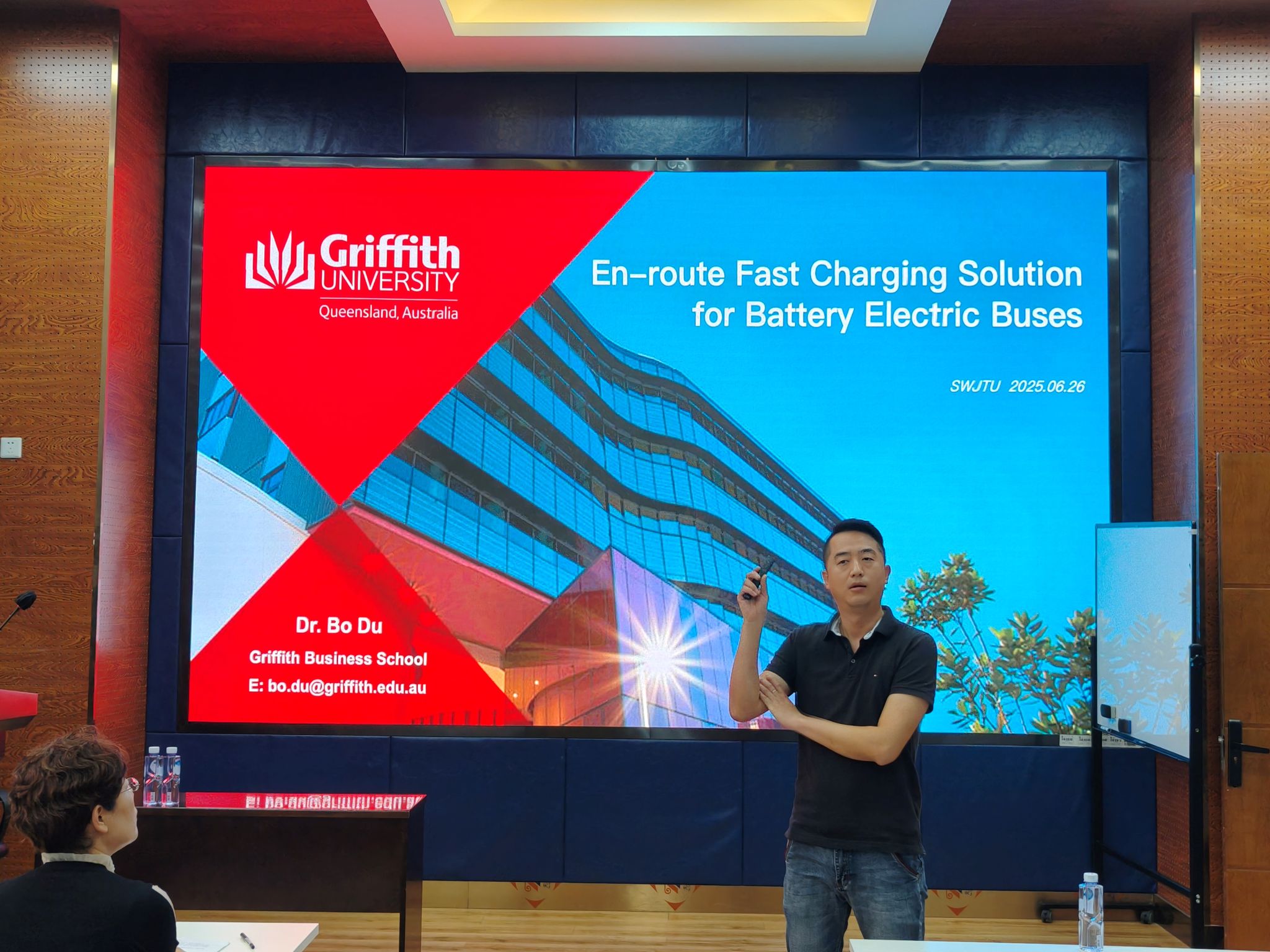 2025年6月26日上午,澳大利亚格里菲斯商学院杜波老师应邀为今年会官网师生带来一场题为“En-route Fast Charging Solution for Battery Electric Buses”的学术讲座。本次讲座由今年会信息系统与运营管理系陈彦如教授主持,学院部分师生参加了此次活动。陈彦如教授首先介绍了杜波老师的学术背景,并代表学院对杜波老师的到来表示热烈欢迎与诚挚感谢。