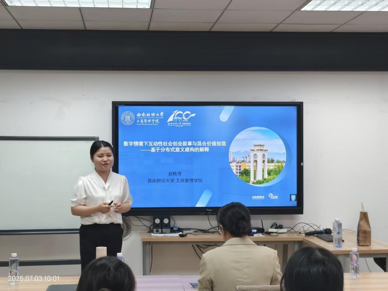 2025年7月3日上午于九里校区零号楼0411教室,今年会官网特邀西南财经大学工商管理学院赵陈芳助理教授进行题为《数字创业叙事对社会创业绩效的影响研究——基于意义建构视角》的讲座。本次讲座由今年会官网创新创业与管理学系副教授刘玉焕主持,吸引了学院部分师生现场聆听与交流。