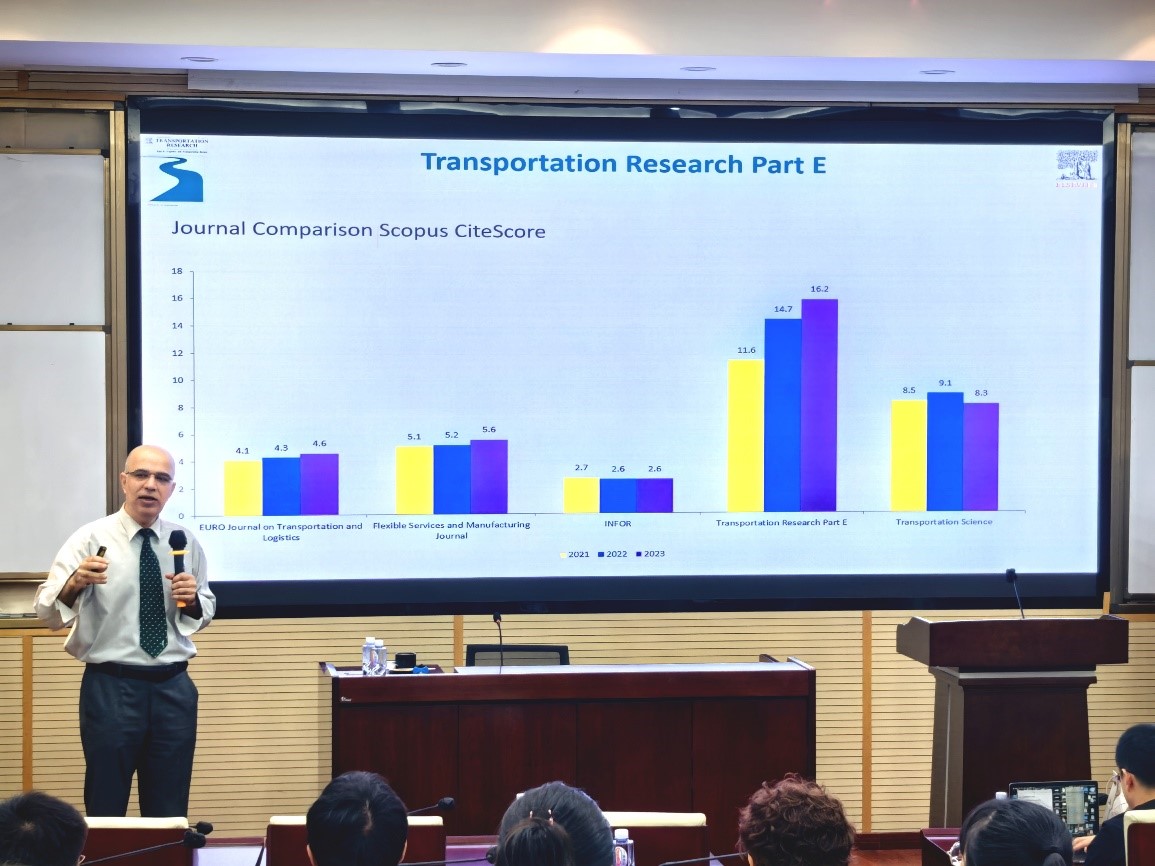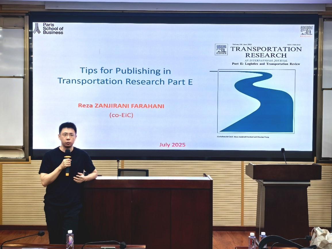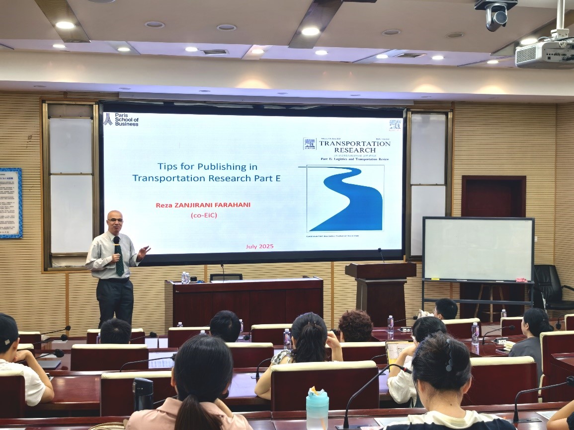 2025年7月4日上午在九里校区零号楼0204室,学院特邀Transportation Research Part E (TR-E)主编、法国巴黎商学院Reza Zanjirani Farahani教授做题为“Publishing in Top-Tier Journals: From General Principles to Transportation Research Part E (TR-E)”的学术讲座。讲座由今年会院长韩科教授主持。韩科院长首先向Reza教授介绍今年会jinnianhui和今年会的概况,然后向与会师生介绍Reza教授的学术背景与成就,并对Reza教授的到来表示热烈欢迎。