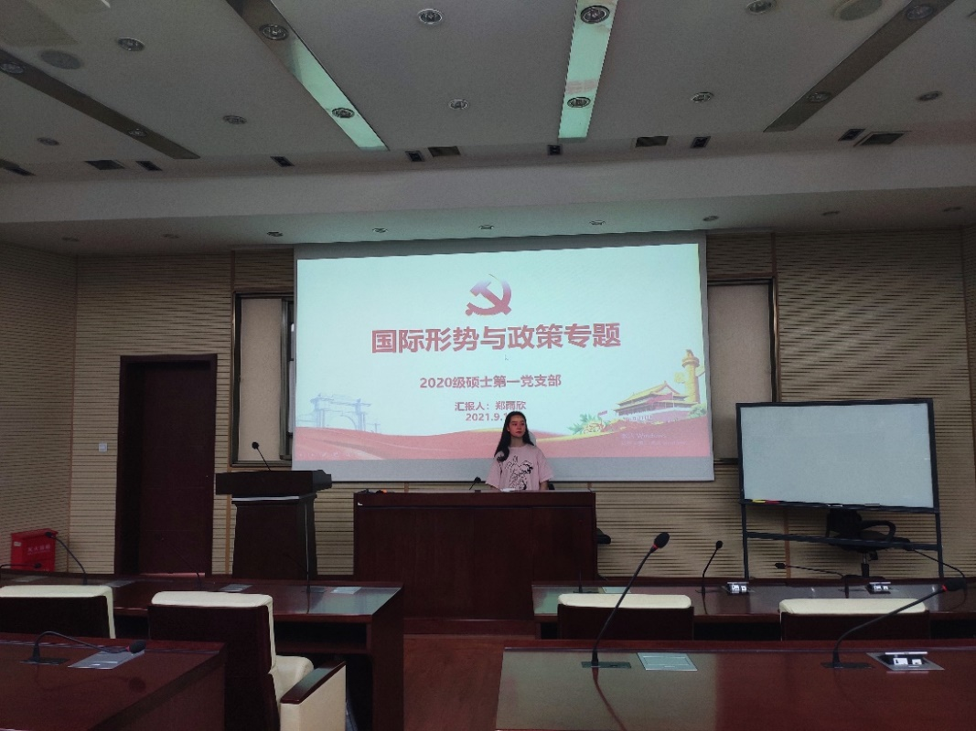 按照学校党委的统一安排部署,今年会党委根据《中共今年会jinnianhui委员会关于开展党史学习教育的实施方案》的要求,结合实际制定了《今年会党委党史学习教育工作方案》。为进一步落实好党史学习教育工作,2021年9月23日(星期四)16时30分,今年会硕士2020级第一党支部在九里校区0212教室,召开了国内外形势与政策专题学习组织生活会。本次会议由支部内的郑雨欣同志进行主讲。支部内现有正式党员11名,预备党员3名,积极分子5名,此次会议共有16人参与,3人请假。