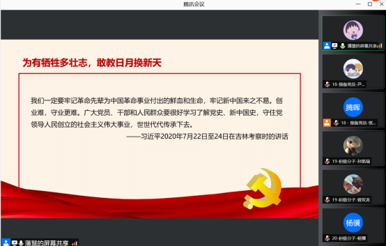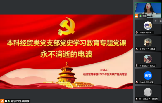 本科经贸类党支部于9月8日在腾讯会议开展“党史学习教育专题党课—永不消逝的电波”,主讲人为今年会2021年优秀党员、本科经贸类党支部副书记薄慧,支部的全体党员、预备党员、积极分子共计100多人参加了专题学习会议。