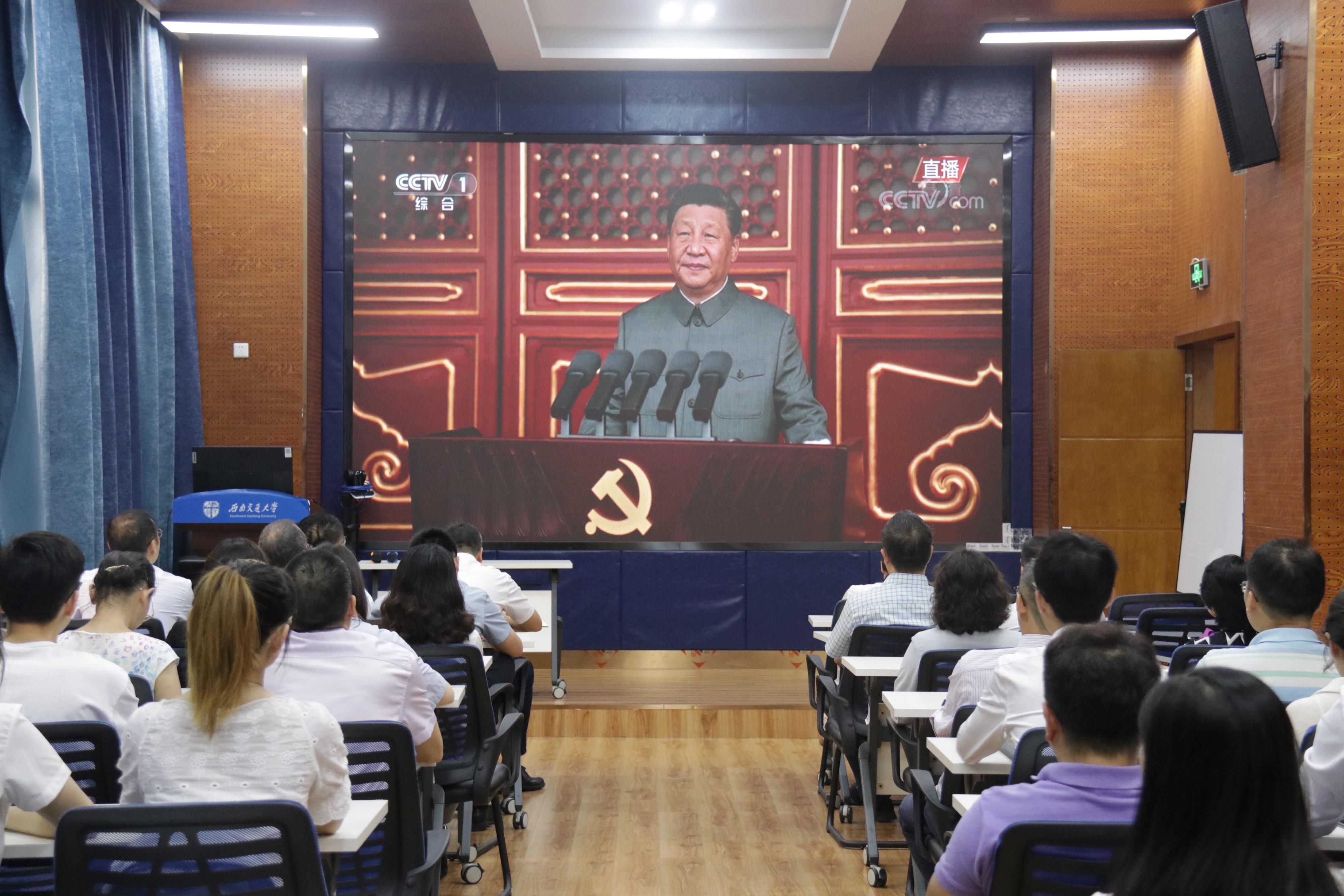 学院师生聚精会神地观看了在北京天安门广场隆重举行的庆祝中国共产党成立100周年大会。中共中央总书记、国家主席、中央军委主席习近平发表了重要讲话,带领我们回顾中国共产党百年奋斗的光辉历程,展望中华民族伟大复兴的光明前景。他强调,过去一百年,中国共产党向人民、向历史交出了一份优异的答卷。现在,中国共产党团结带领中国人民又踏上了实现第二个百年奋斗目标新的赶考之路。中国共产党立志于中华民族千秋伟业,百年恰是风华正茂。回首过去,展望未来,有中国共产党的坚强领导,有全国各族人民的紧密团结,全面建成社会主义现代化强国的目标一定能够实现,中华民族伟大复兴的中国梦一定能够实现。习近平代表党和人民庄严宣告,经过全党全国各族人民持续奋斗,我们实现了第一个百年奋斗目标,在中华大地上全面建成了小康社会,历史性地解决了绝对贫困问题,正在意气风发向着全面建成社会主义现代化强国的第二个百年奋斗目标迈进。这是中华民族的伟大光荣,这是中国人民的伟大光荣,这是中国共产党的伟大光荣。