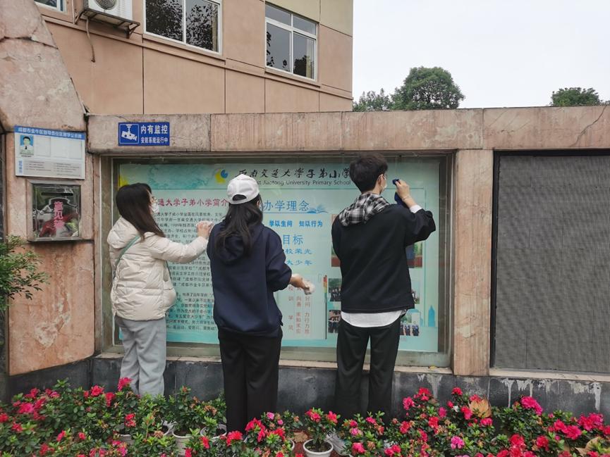 在第一项志愿活动——宣传栏清理中,工商和会计专业的志愿者们分成了三个小组,于11月7日上午分别对交大子弟小学宣传栏、一食堂旁的宣传栏以及三食堂旁的宣传栏进行了清理与打扫。
