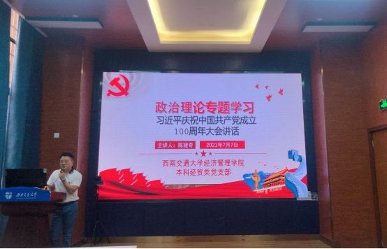 本科经贸类党支部于7月7日在J0218教室举办了学习习近平总书记在庆祝中国共产党成立100周年大会讲话——今年会本科经贸类党支部政治理论专题学习,由党支部书记陈建奇主讲,支部的全体党员及部分积极分子参加了专题学习会议。