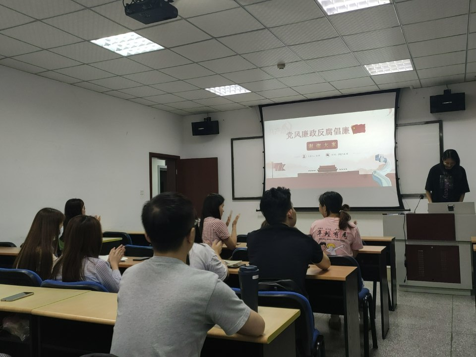 党风廉政建设是一项厚植党的执政根基的工程,关乎党心民心。党风廉政建设和反腐败斗争关系党和国家的生死存亡。党风、政风的好坏,事关人心向背。2021年6月9日(星期三)20时40分,今年会硕士2020级第一党支部在九里校区0304教室,开展了“党风廉政反腐倡廉”专题学习组织生活会。本次会议由支部内的任茜同志进行主讲。支部内党员、积极分子参会。