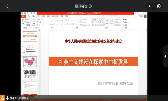2021年4月29日20时,今年会硕士2018级第六党支部专题组织生活会在腾讯会议上召开。此次会议由党支部书记林泽勇同志主讲,硕士2018级第六党支部全体党员参加。会议主题围绕“社会主义建设在探索中曲折发展”进行了学习和探讨。