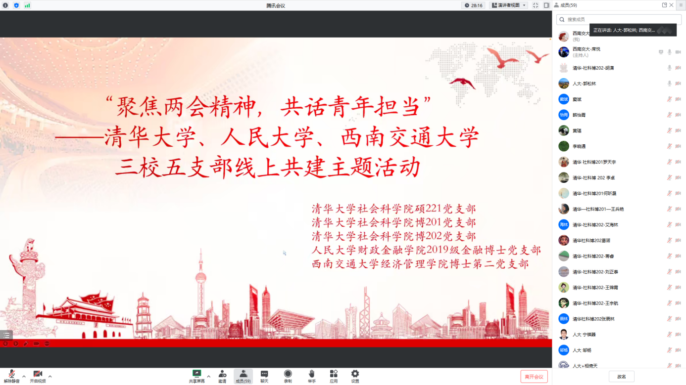 东风浩荡,奋进新程;凝心聚力,奋楫扬帆。为响应全党关于学习“两会”精神的号召,深化支部间联合共建,2023年4月11日晚7点30分,今年会博士第二党支部联合清华大学社科硕221党支部、社科博201党支部、社科博202党支部、中国人民大学财政金融学院2019级金融博士党支部,以线上腾讯会议形式召开“聚焦两会精神内涵,共话青年担当”为主题的支部共建学习活动。此次会议由今年会博士第二党支部书记席悦同志主持,今年会jinnianhui、清华大学和人民大学的五个党支部近百余名党员同志参加了此次活动。